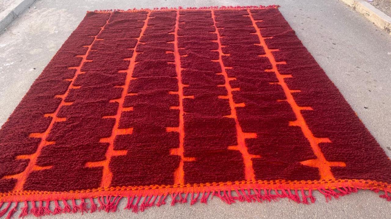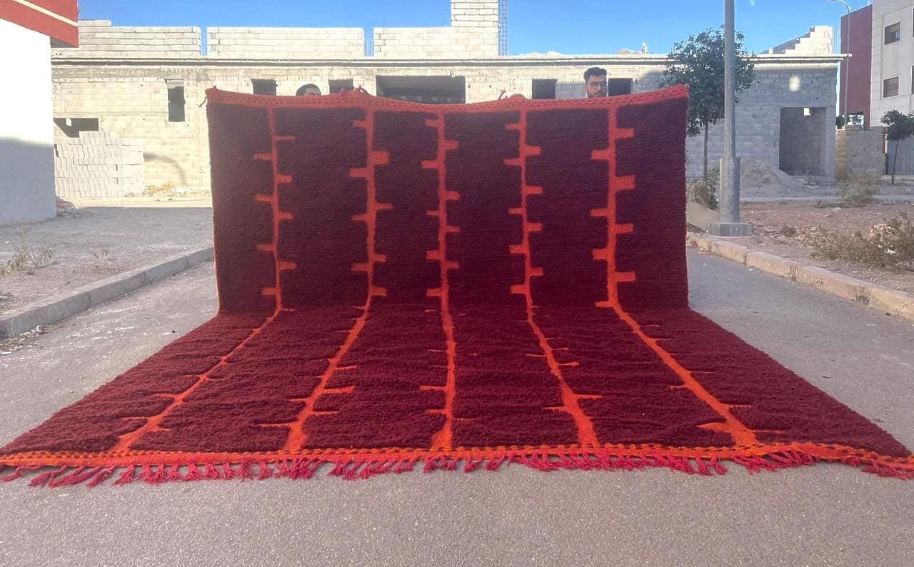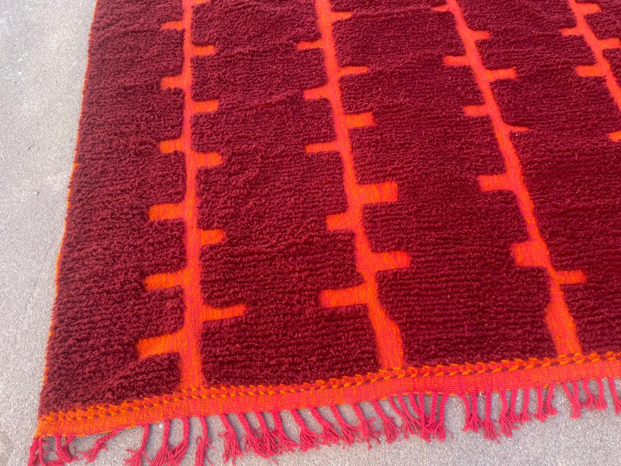 Discover the elegance of traditional craftsmanship with this authentic Beni Ourain rug from Morocco. Hand-knotted by Berber women using soft, high-quality wool, it features a stunning geometric pattern with a luxurious burgundy center framed by warm beige accents. This plush rug will bring comfort and bold style to your living room, bedroom, or dining room. Its warm texture and vibrant color palette make it a versatile decorative element for modern, bohemian, and eclectic interiors, bringing warmth, authenticity, and artisanal charm to any room.