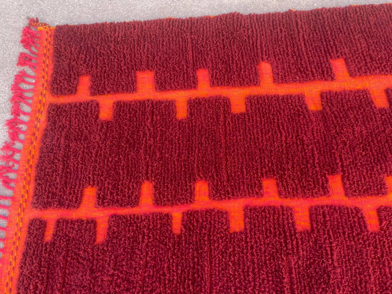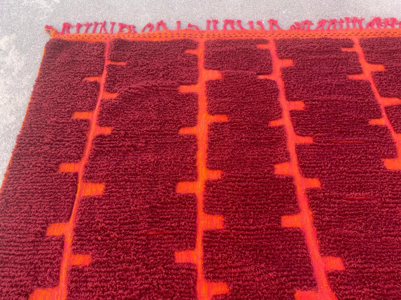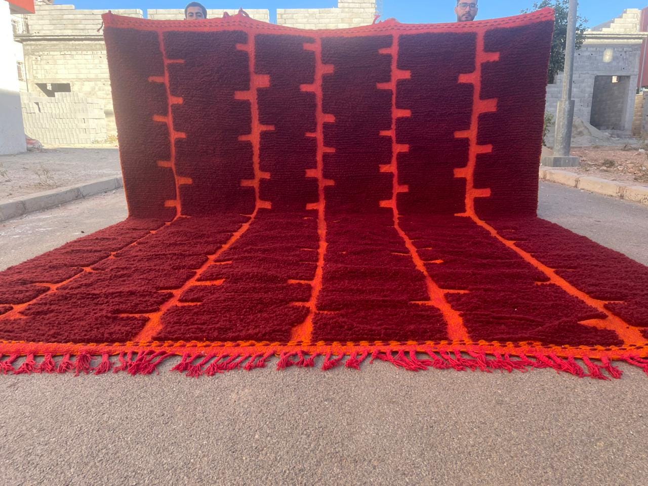 Discover the elegance of traditional craftsmanship with this authentic Beni Ourain rug from Morocco. Hand-knotted by Berber women using soft, high-quality wool, it features a stunning geometric pattern with a luxurious burgundy center framed by warm beige accents. This plush rug will bring comfort and bold style to your living room, bedroom, or dining room. Its warm texture and vibrant color palette make it a versatile decorative element for modern, bohemian, and eclectic interiors, bringing warmth, authenticity, and artisanal charm to any room.